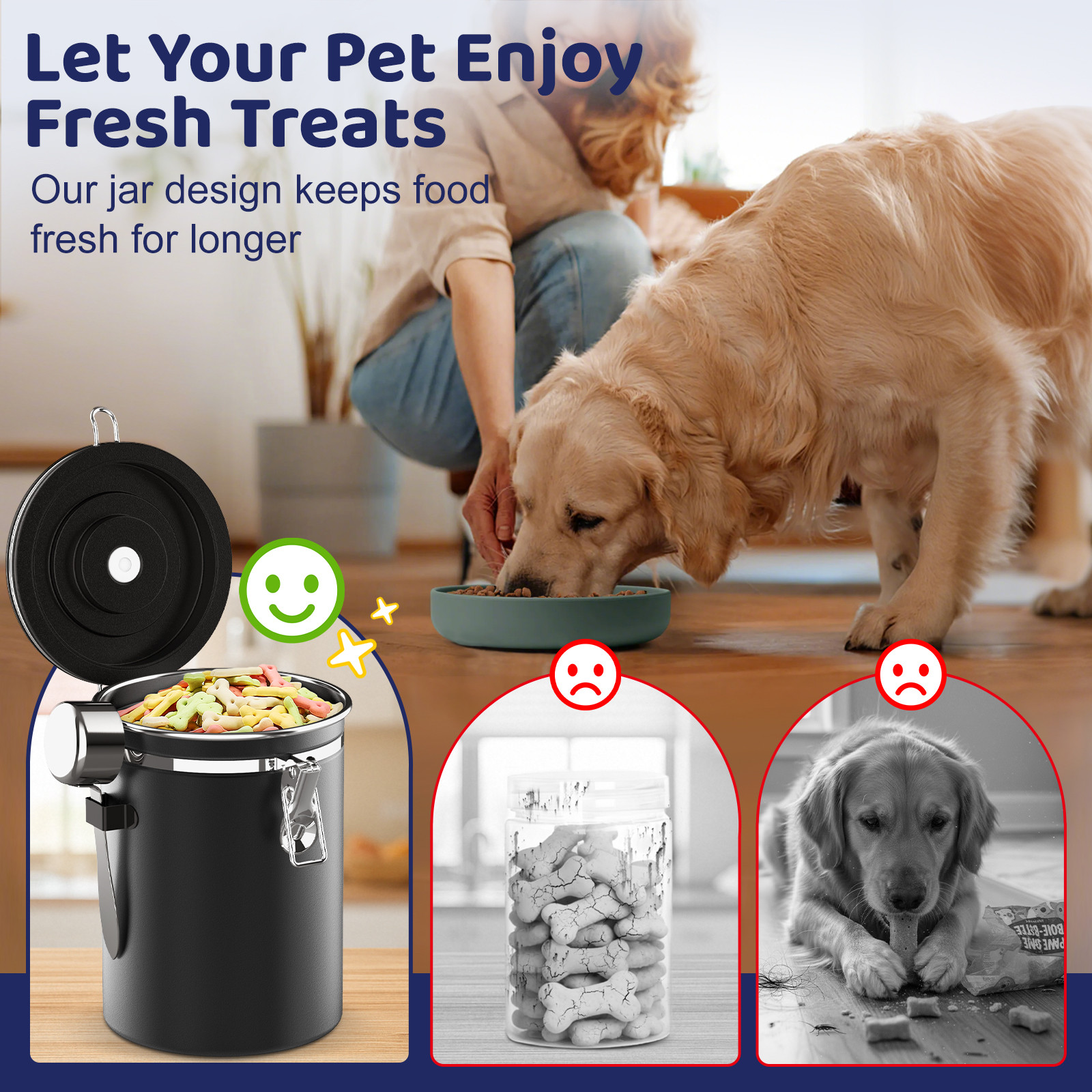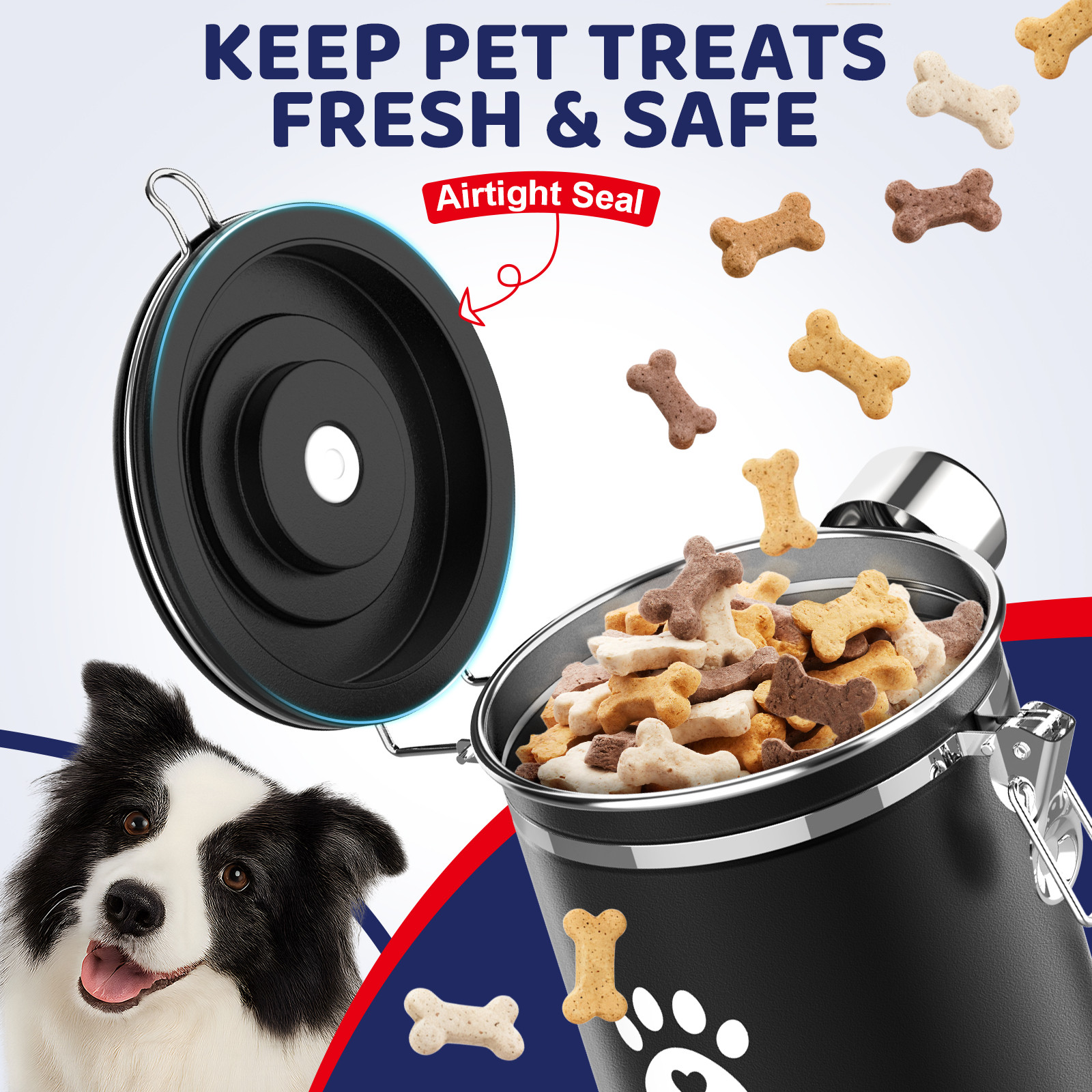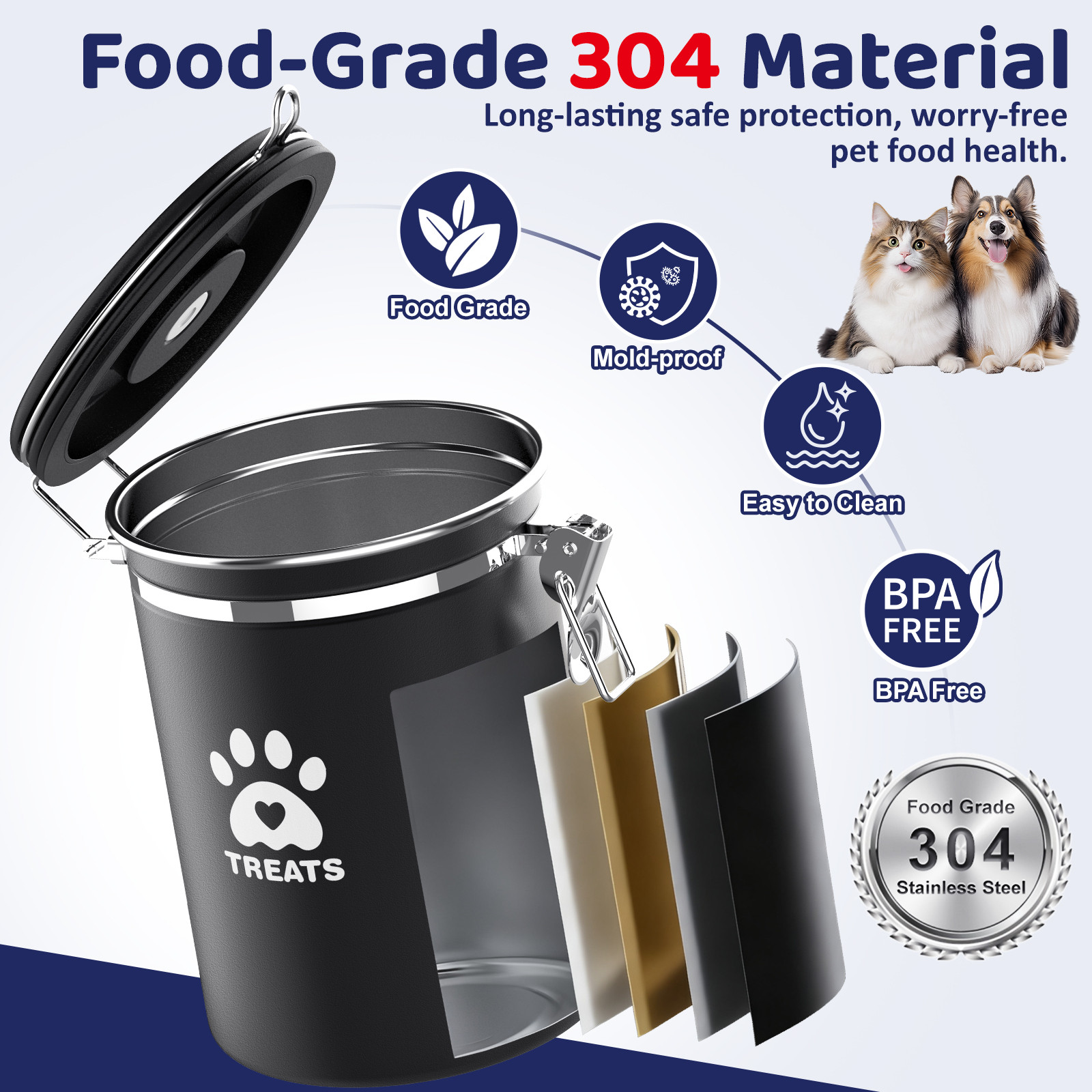 Safety Assured,Durability Guaranteed:Dog treat container airtight crafted from food-grade 304 stainless steel,the canister body is BPA-free, free of harmful substances,corrosion-resistant,and rust-proof—safe for direct contact with pet treats, so you can rest easy even when your pet licks the inside. Plus, it lasts over 5x longer than plastic canisters, standing up to daily use for years
