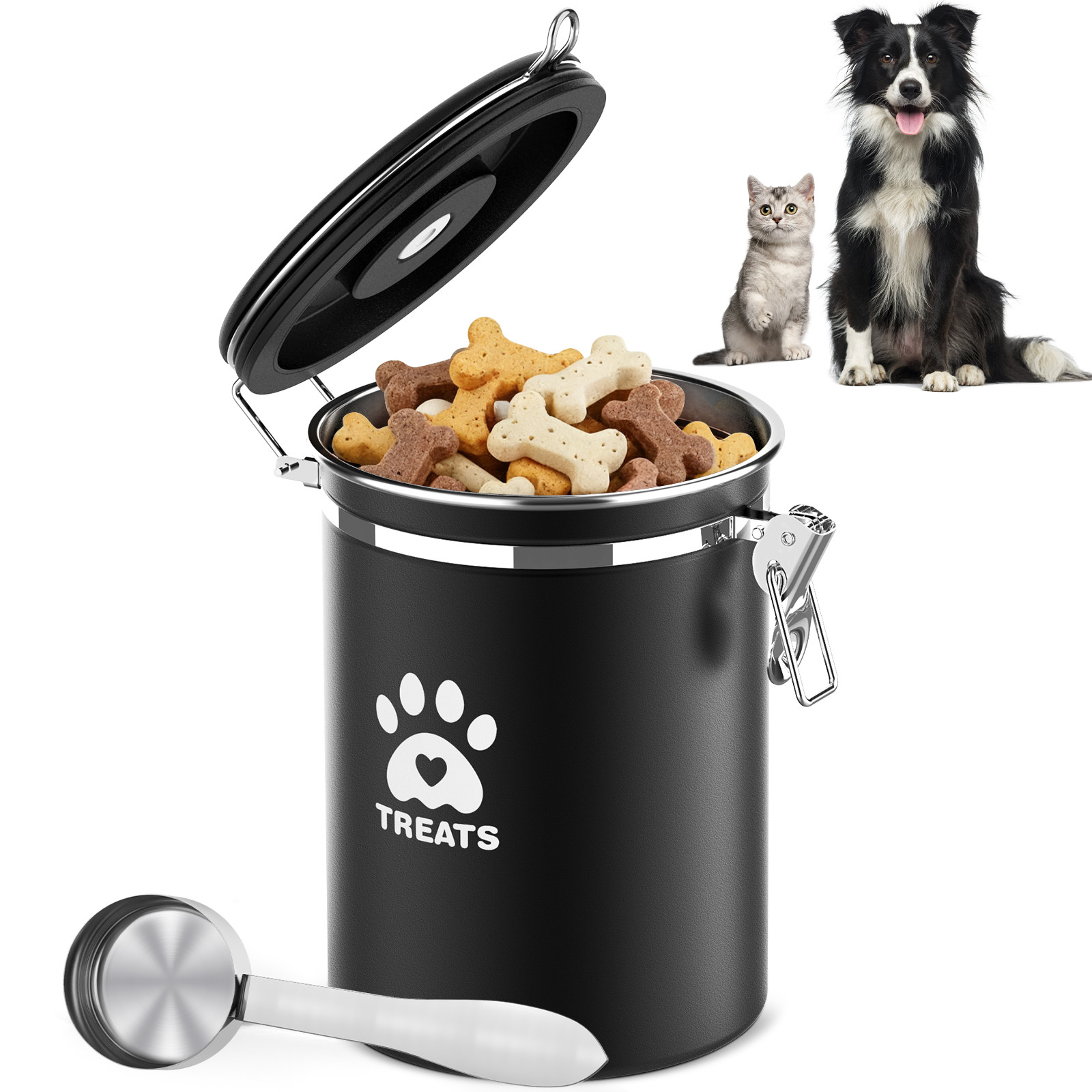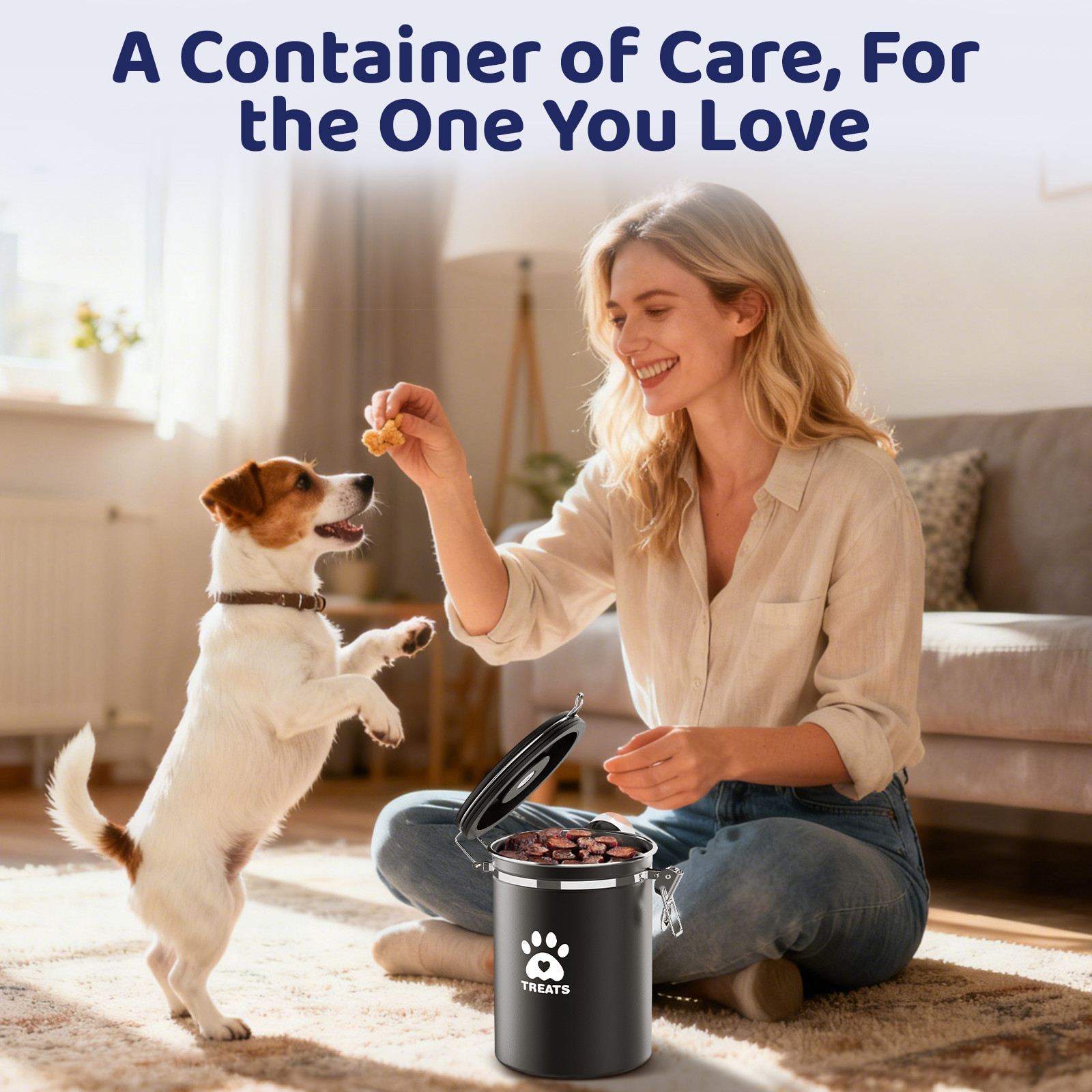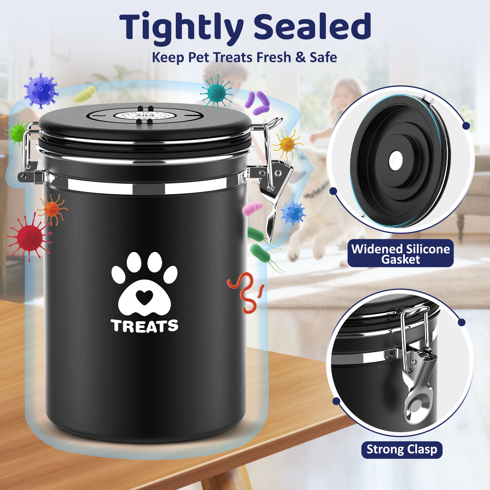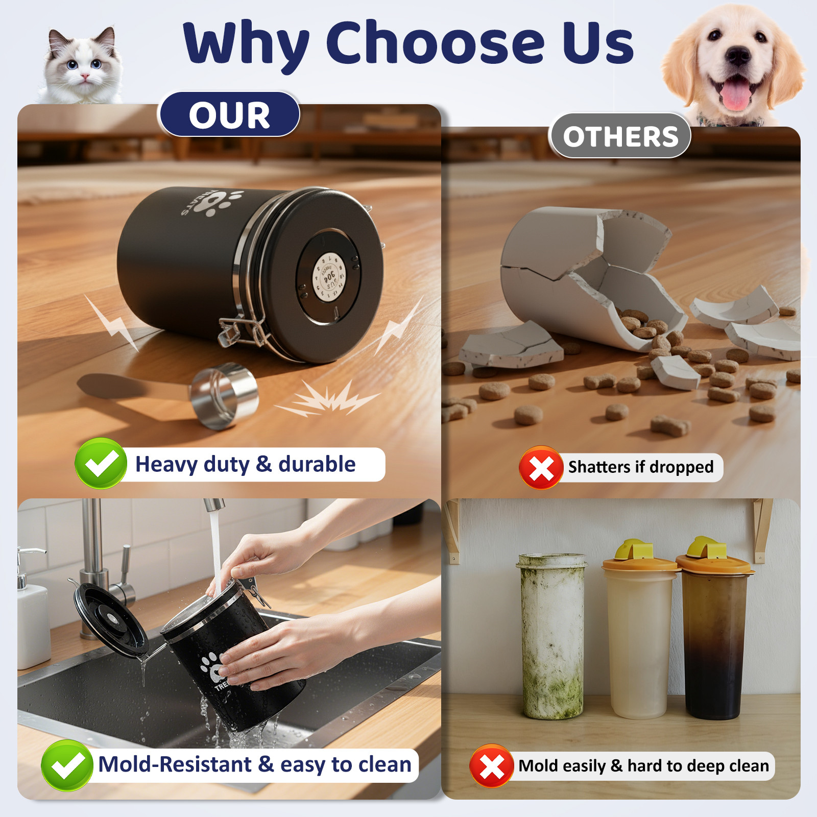 Safety Assured,Durability Guaranteed:Dog treat container airtight crafted from food-grade 304 stainless steel,the canister body is BPA-free, free of harmful substances,corrosion-resistant,and rust-proof—safe for direct contact with pet treats, so you can rest easy even when your pet licks the inside. Plus, it lasts over 5x longer than plastic canisters, standing up to daily use for years