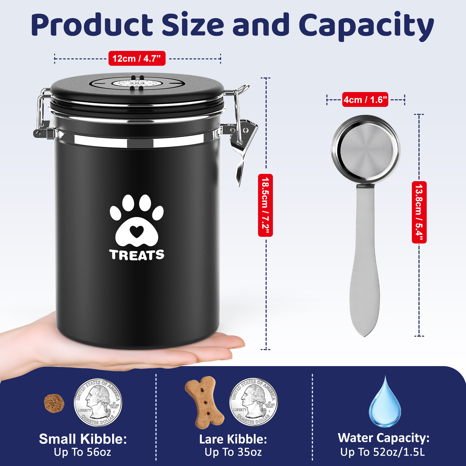 Generous Storage Container & Included Scoop:This large pet treat storage container measures 7.2 inches in height by 4.7 inches in diameter, offering a substantial 63 oz capacity to keep all your pet's favorites fresh.It also includes a free treat scoop for convenient and mess-free serving