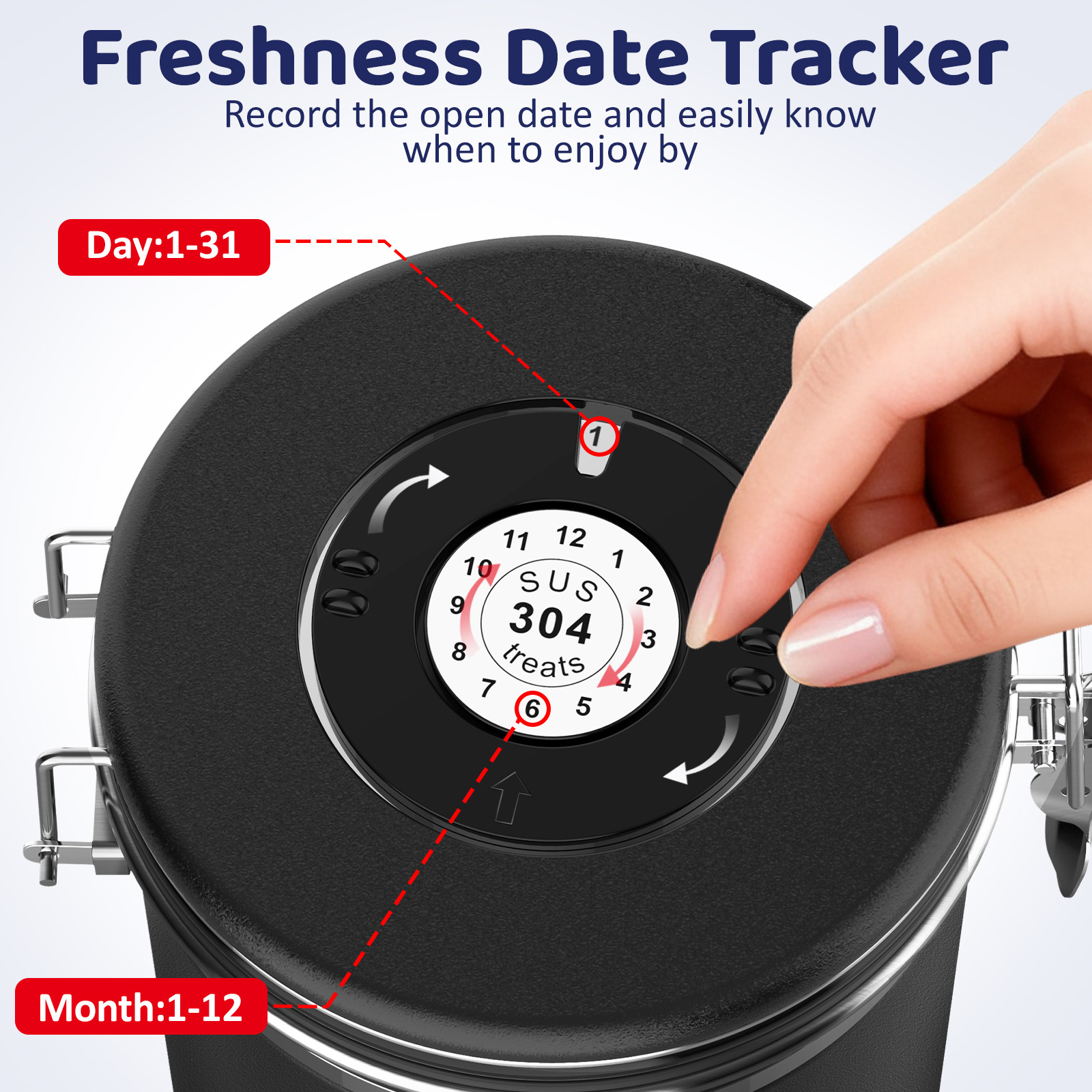 Date Tracker:Never guess freshness again! Our dog treat jar for kitchen counter features a built-in calendar-style date dialon the lid—simply rotate to mark storage or expiry dates in seconds.They ensure your furry friend always gets fresh, unexpired snacks