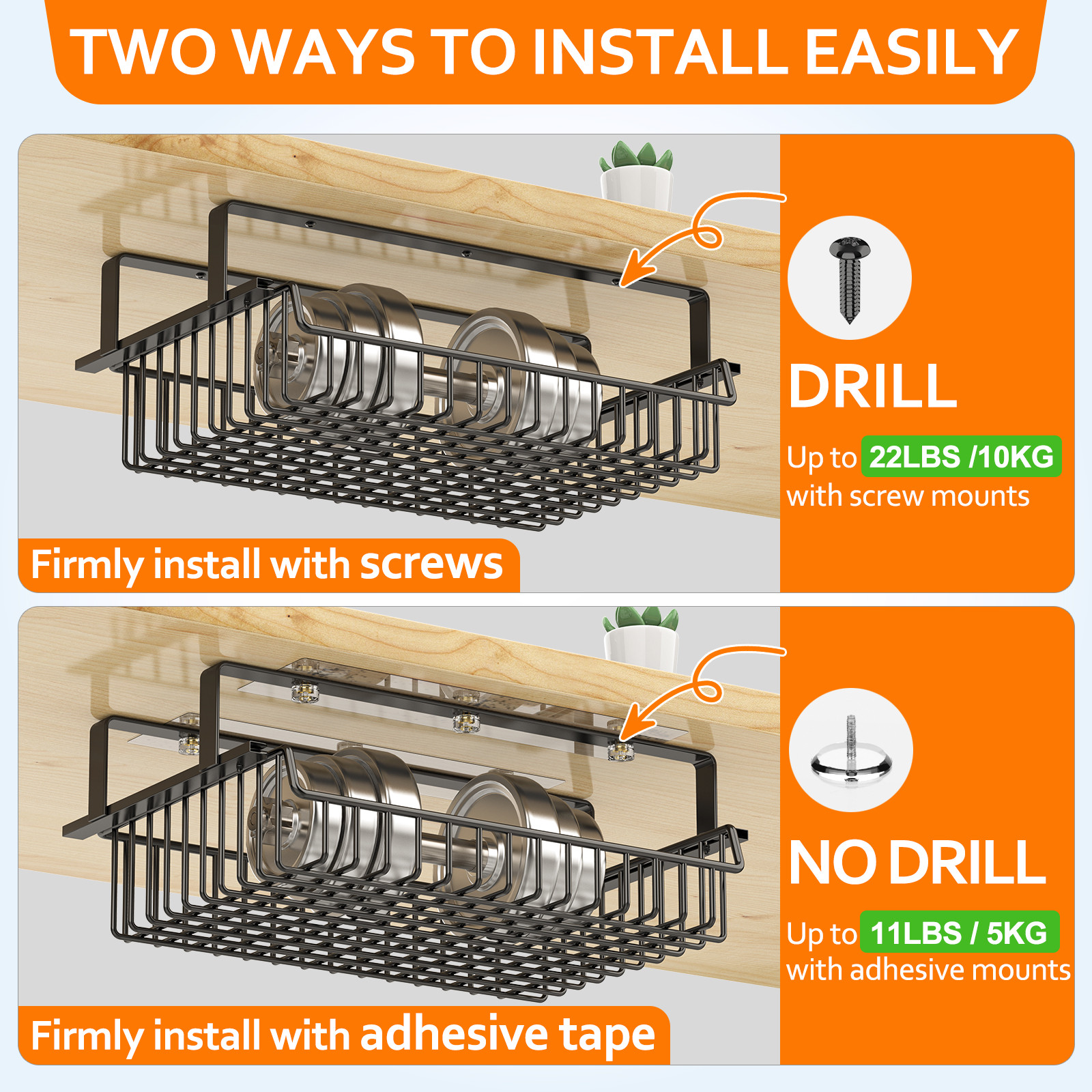 【Two Install Methods】: This under desk organizer comes with strong adhesive tape and short screws for different needs. The under table storage drawer with adhesive tape can hold up to 11 lbs for daily use, while the screws can hold up to 22 lbs for all kinds of desks or cabinets